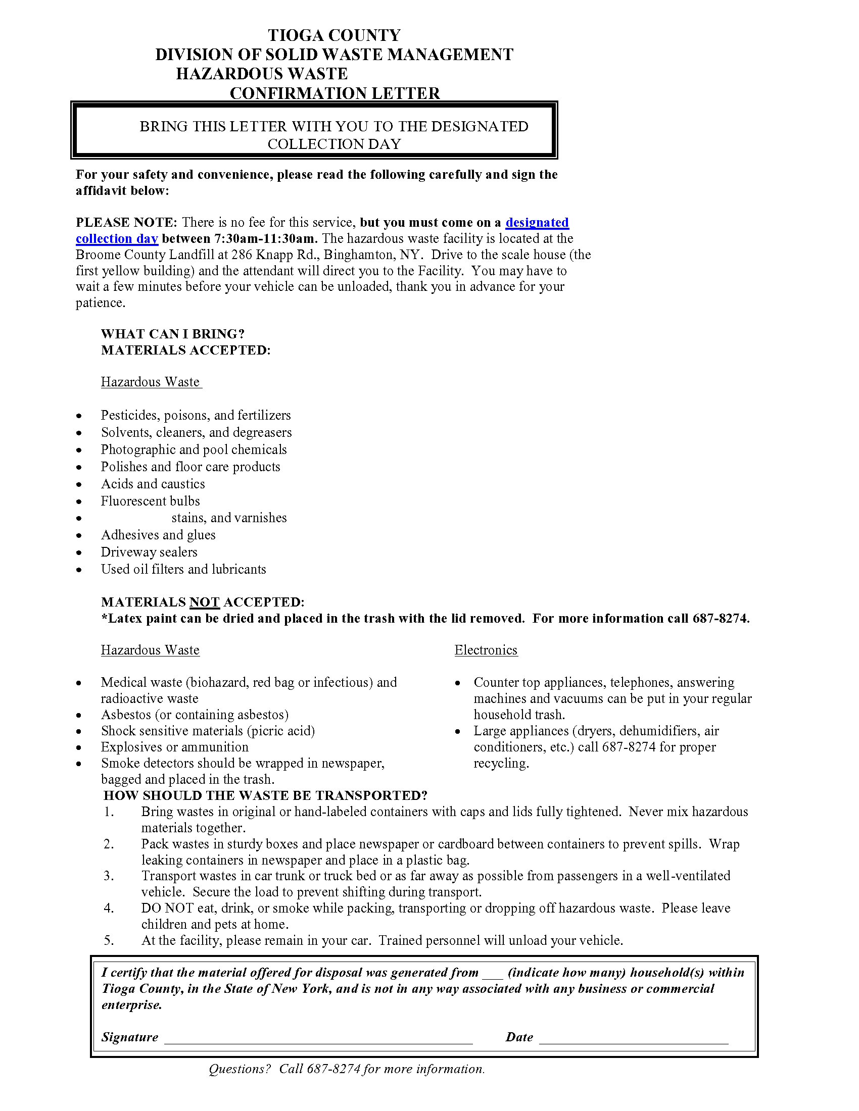Residents are encouraged to print and complete the required confirmation letter prior to arriving at the designated collection. Click Here for the Tioga County Confirmation Letter